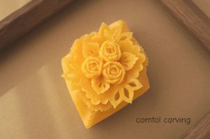 薔薇と葉をはちみつ石けんに彫りました。